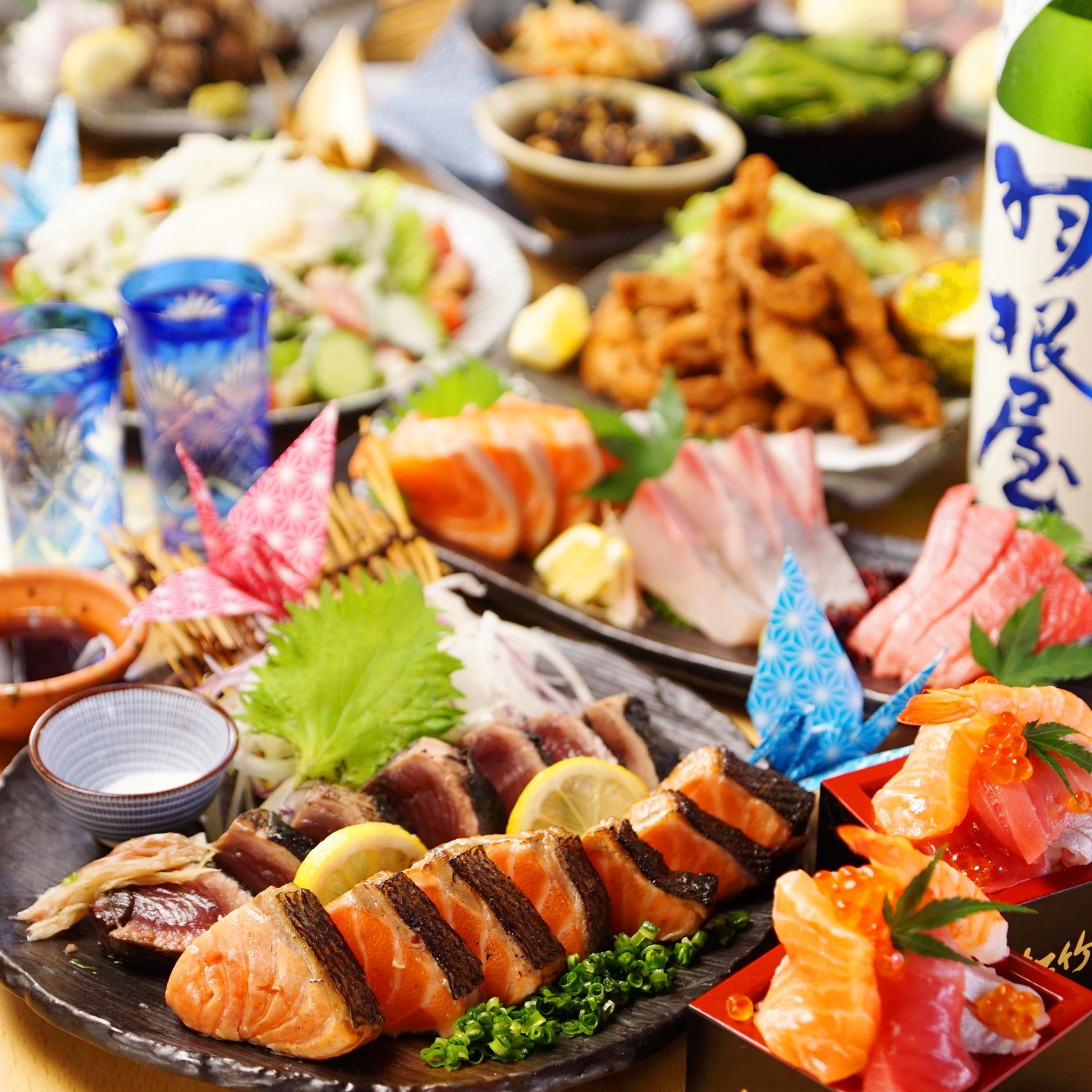 宴会・飲み会におすすめの週末も3時間飲み放題!!「名物藁焼き2点盛り サーモン、鰹の藁焼き塩たたき」「チキン南蛮」「カツオの漁師飯」など全8品のコースで3時間飲み放題付き!!豪快な炎で焼き上げる名物『藁焼き』をご堪能下さい♪人数に応じた半個室有りご用意致します!■3時間飲み放題付き※12月金土・26~30は2時間制(L.O.30分)