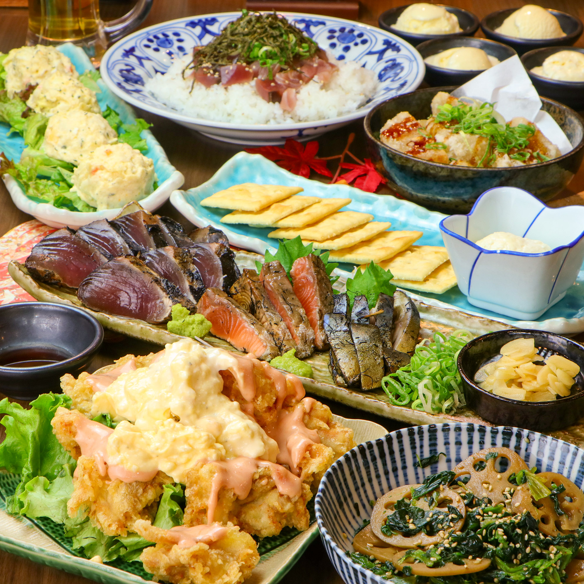 ※金土祝前日は17時半までにスタートもしくは20時半以降のみ利用OK ※12月5、6、11~30日は利用不可 【前菜】 れんこんと菜の花の胡麻和え 【前菜】 王様クリームチーズ 【藁焼き】 名物!カツオの藁焼き塩タタキ 【サラダ】 たまごたっぷりポテトサラダ 【揚げ物】 ポテトフライ&唐揚げ 【〆】 豚丼 【デザート】 バニラアイス |